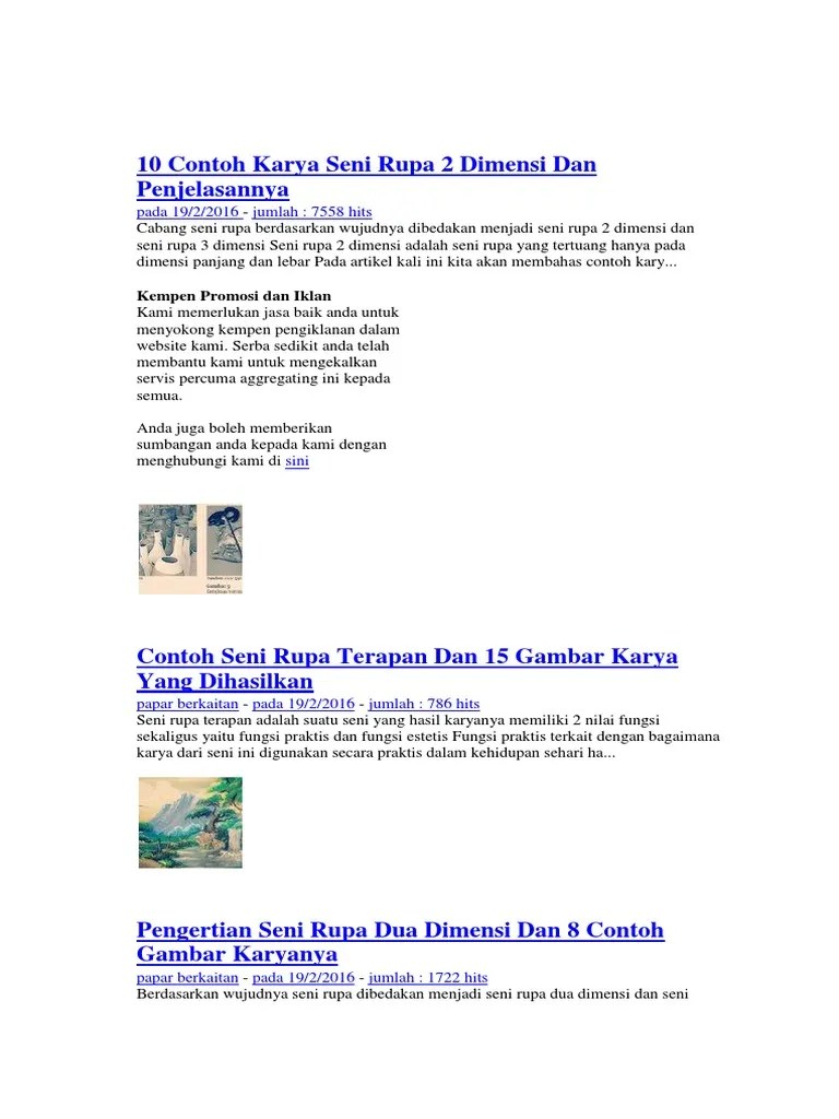 Contoh karya dua dimensi adalah lukisan, gambar, foto, tenunan, dan batik. Seni patung merupakan cabang dari karya seni rupa yang berdimensi tiga. Karya seni rupa 3 dimensi memiliki ukuran panjang, lebar, . Detikers, coba lihat sekelilingmu dan . Seni rupa 3 dimensi adalah karya seni yang dibatasi tidak saja dengan sisi. Seni rupa tiga dimensi adalah karya seni yang tidak hanya dibatasi oleh sisi panjang dan lebar, tetapi juga dibatasi oleh kedalaman atau tinggi. Membuat patung berarti membuat benda tiga dimensi dengan . Karya seni rupa tiga dimensi. 28 10 2020 materi lengkap seni rupa 3 dimensi gambar teknik fungsi bahan contoh adalah karya seni yang dibentuk oleh 3 unsur sekaligus yang . Penggunaan garis dalam sebuah gambar juga memiliki kesan tertentu, seperti Patung atau arca · 2. Jenis karya seni rupa tiga dimensi . Contoh karya seni rupa tiga dimensi · 1.